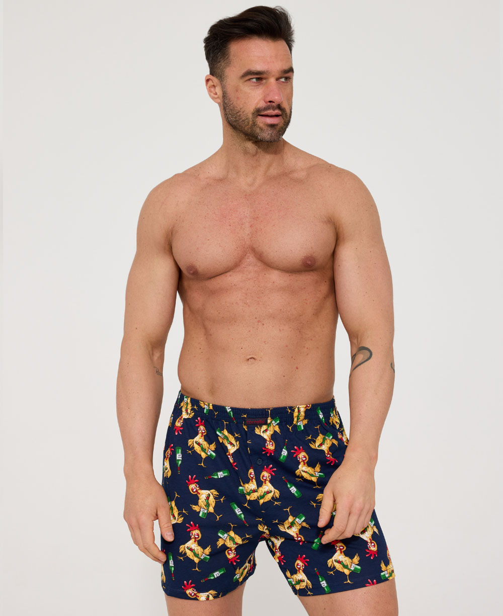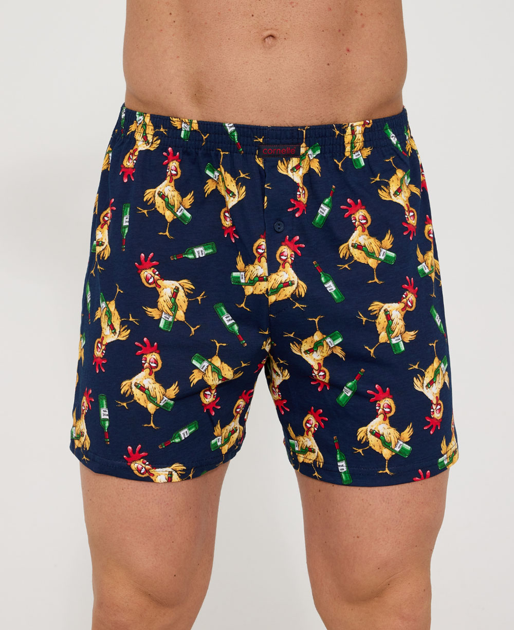Стиль, комфорт та дрібка гумору в одному флаконі! Чоловічі боксерки Cornette 011/186 Classic у темно-синьому кольорі прикрашені кумедним принтом курчати з келихом вина. Це ідеальний вибір для чоловіків, які цінують якісну білизну та мають самоіронію.