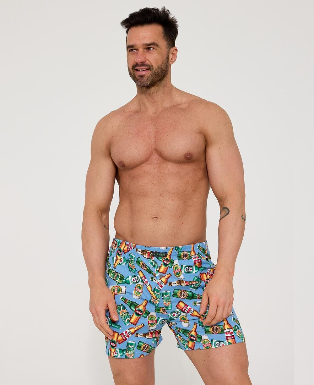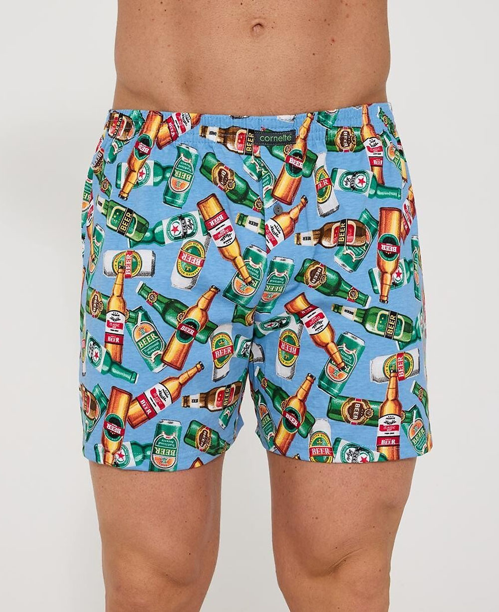 Ідеальний вибір для чоловіків, які цінують комфорт та легкий гумор! Чоловічі боксерки Cornette 011/189 Classic у приємному блакитному кольорі прикрашені кумедним принтом пивних пляшок. Це не лише зручна білизна, а й чудовий спосіб підкреслити своє почуття стилю та любов до пінного напою.