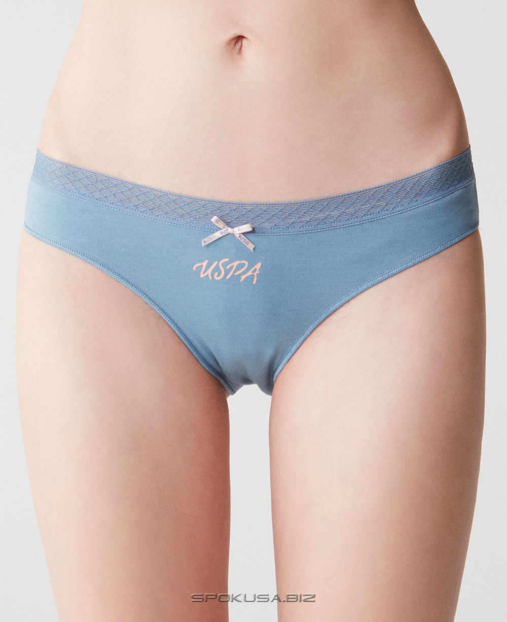 Жіночі трусики сліпи зроблені з високоякісної бавовняної тканини з додаванням еластану. Мають низьку посадку. Зверху прикрашені елегантною, еластичною мереживною стрічкою та атласним бантиком з написом USPA.