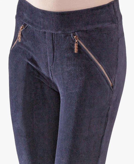 Облягаючі жіночі легінси зроблені з трикотажного полотна "вельвет", з боковими кишенями. По низу бокових швів - розрізи з декоративними блискавками. Легінси мають широкий, еластичний пояс з резинкою всередині.