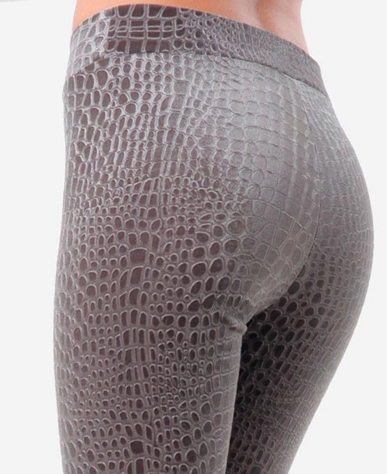 Жіночі облягаючі трикотажні легінси без бокових швів, зроблені з бархатного трикотажного полотна з тисненим малюнком. Легінси мають широкий, еластичний пояс з резинкою всередині.