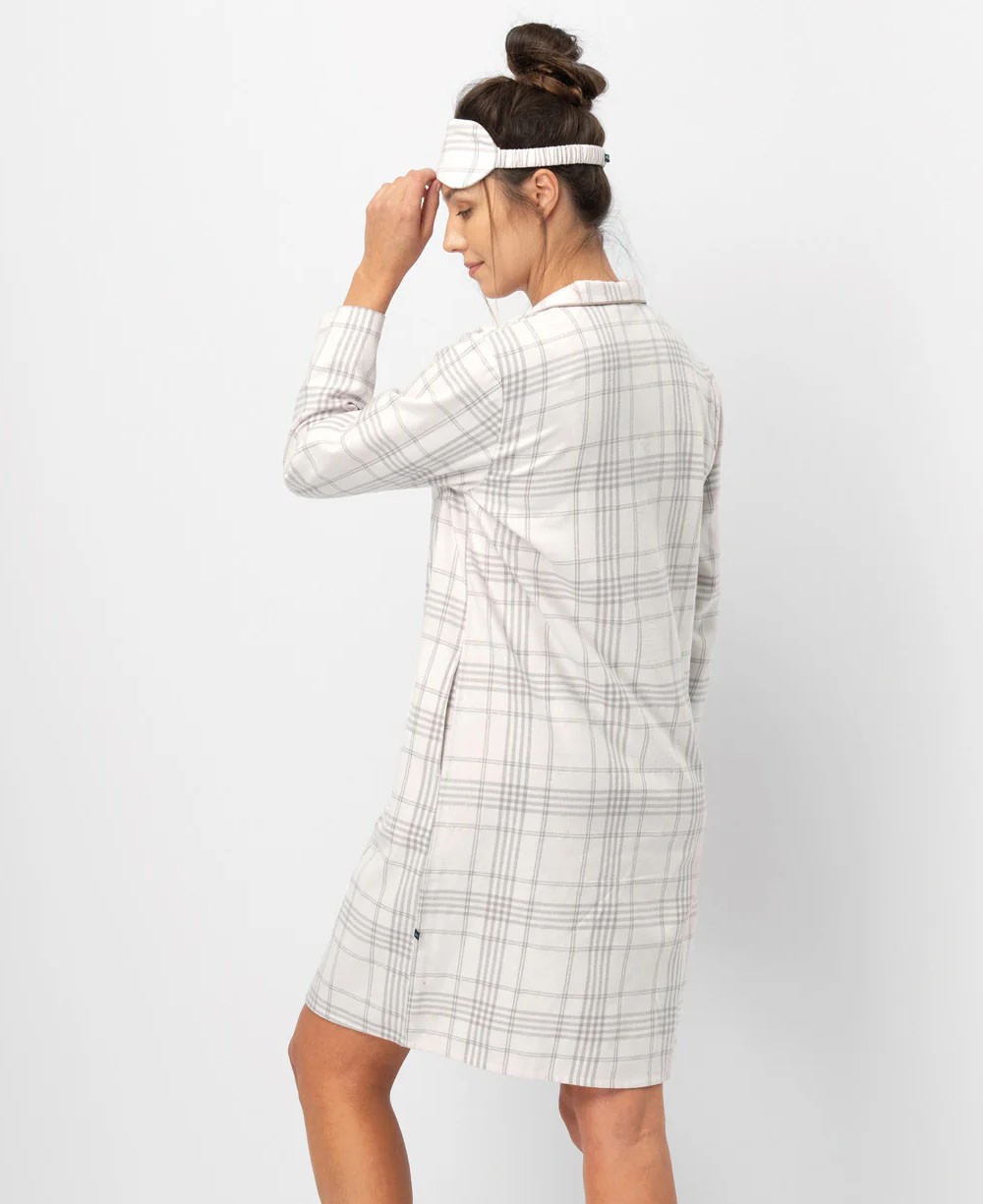 Сукня-сорочка Key LND 401 B25 – ідеальний вибір для затишних вечорів вдома та комфортного сну восени й взимку. Модель виконана з натуральної бавовняної фланелі, має прямий класичний крій, застібку на гудзики і дві місткі бокові кишені. Світло-сірий і темно-сірий картатий принт додає елегантності та універсальності, а ніжна фланель чудово зберігає тепло та дарує приємні тактильні відчуття. Довгі рукави, декоративний карман на грудях і акуратний комір роблять сорочку стильною та практичною навіть для подарунку.