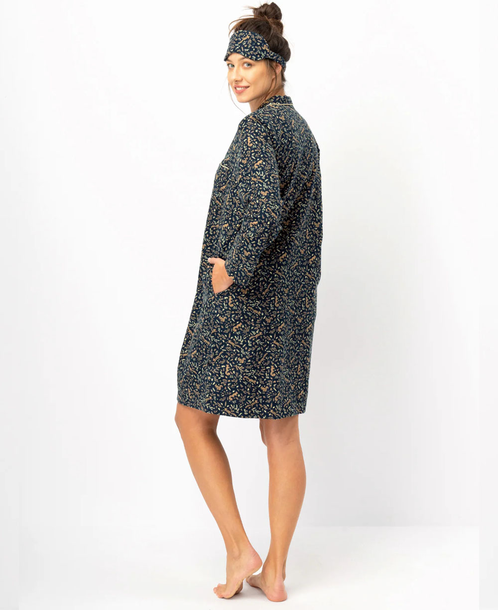 Жіноча нічна сорочка KEY LND 706 B25 виготовлена з якісної і м’якої 100% бавовняної фланелі. Колірна палітра — ніжні приглушені бежево-графітові тони з принтом білки і листя — створює затишний і теплий настрій. Сорочка має довгі рукави, відкладний комір, застібку на ґудзики по всій довжині, манжети і маленьку накладну кишеню спереду. Подовжена спинка забезпечує комфорт при русі і додатковий захист від холоду. Ідеальна для осені та зими, дарує тепло і затишок у холодну пору року.