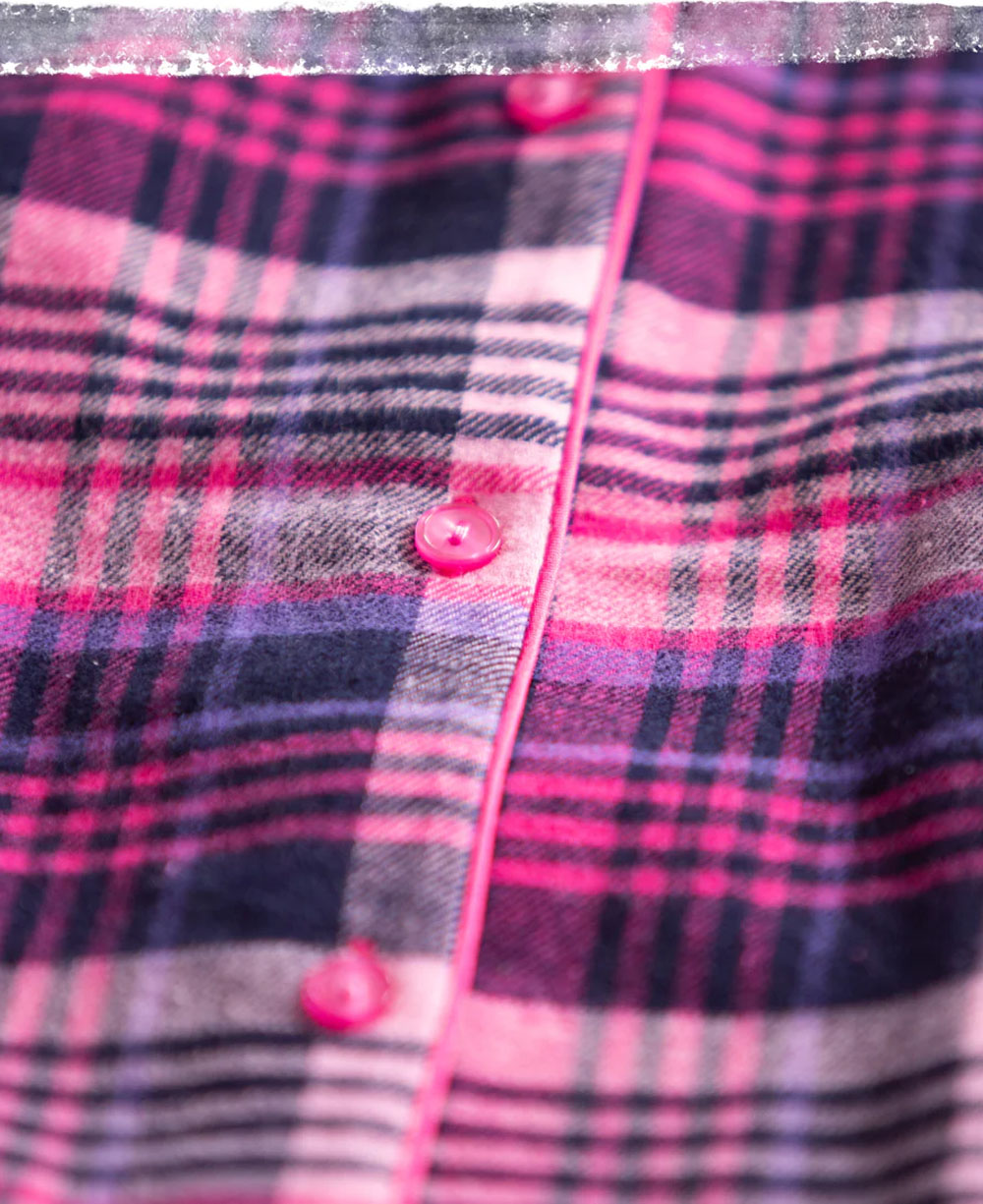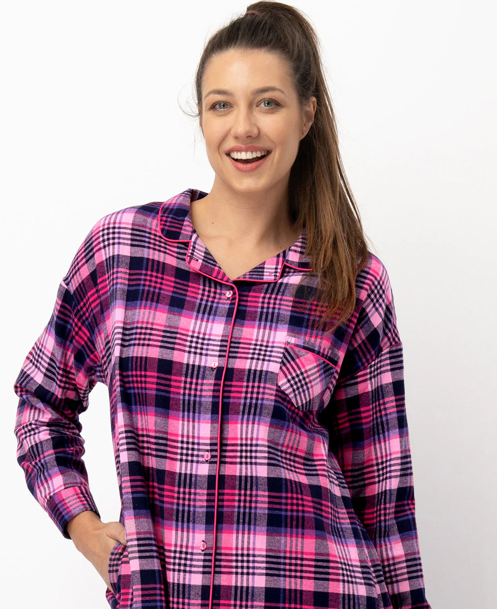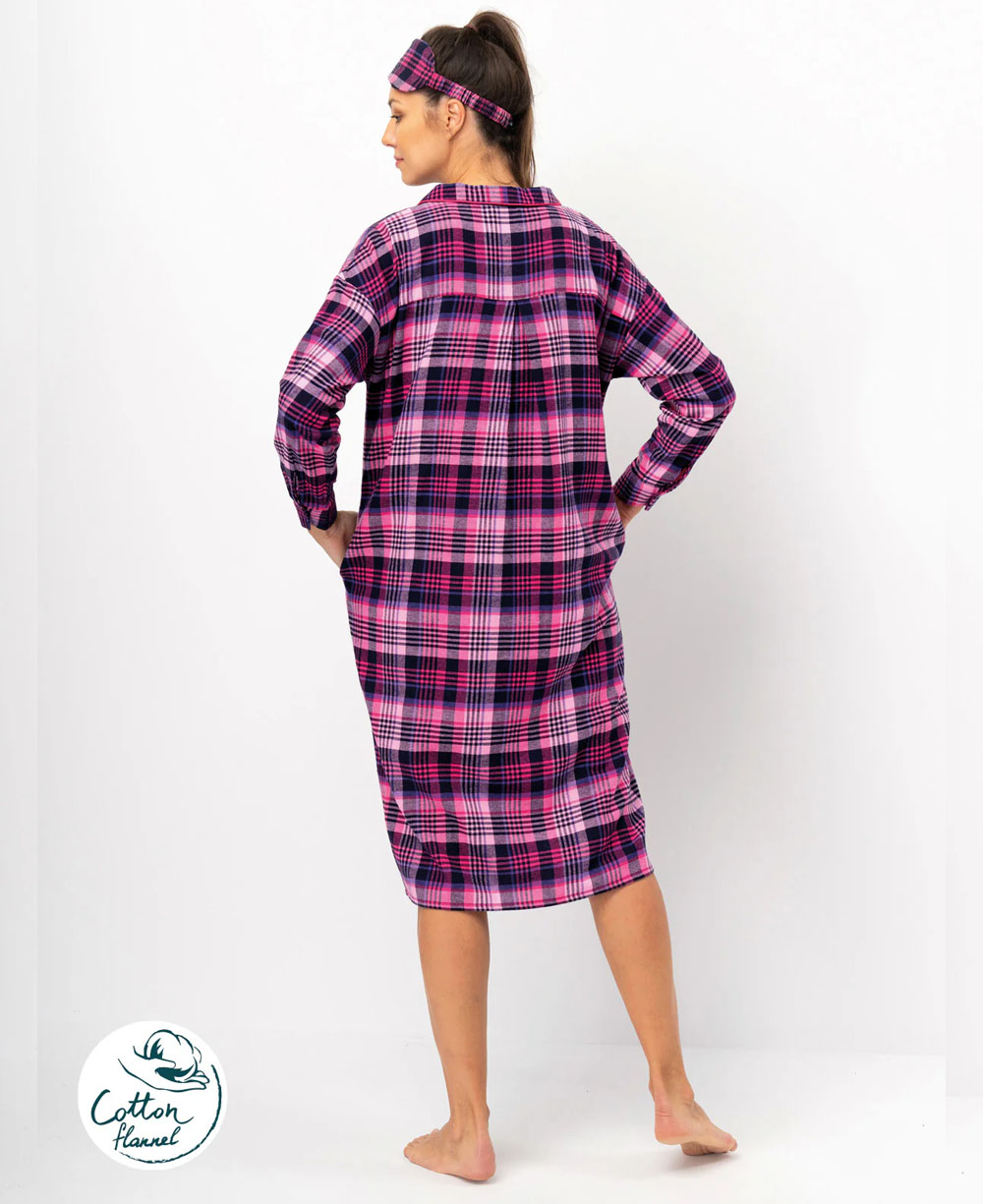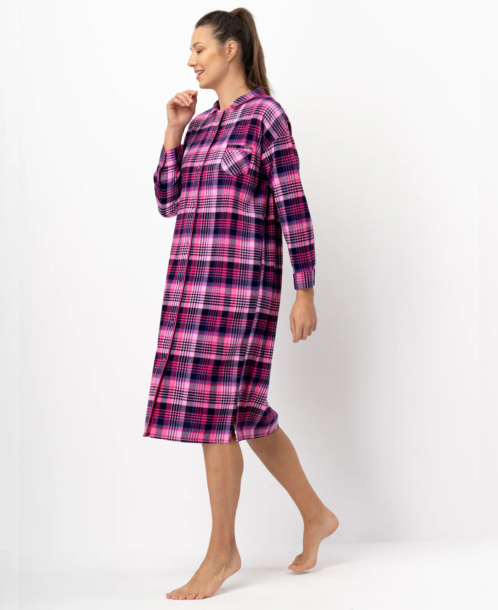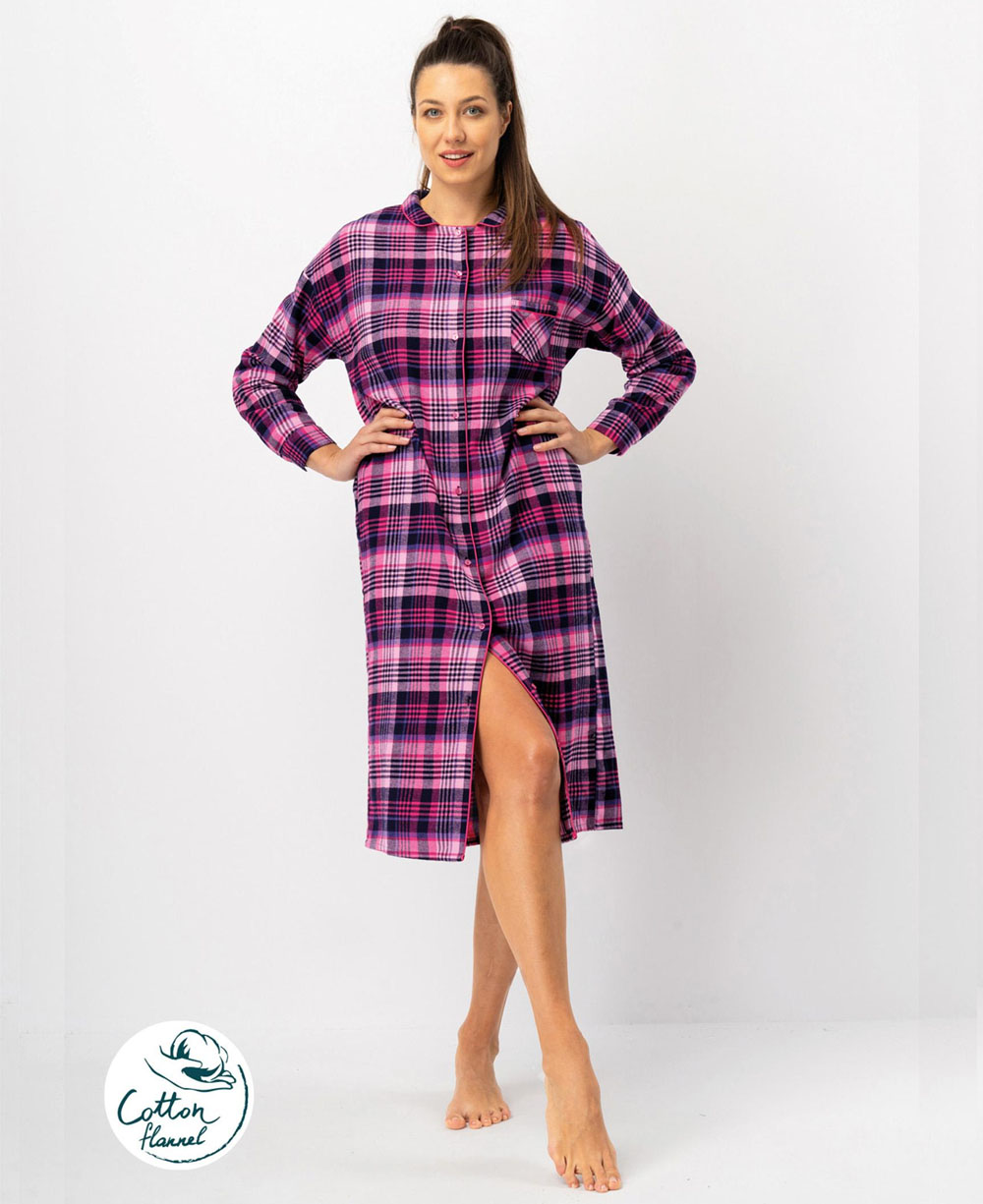 Жіноча нічна сорочка KEY LND 490 B25 виготовлена з м’якої та якісної бавовняної фланелі. Сорочка рожевого кольору з чорним картатим принтом, має вільний силует і довжину трохи нижче колін. Модель оснащена довгими рукавами з манжетами, заниженим плечовим швом, відкладним коміром і застібається на ґудзики. Спинка оброблена кокеткою та продовжньою складкою для додаткового комфорту. Має зручні бокові кишені і невеликі розрізи знизу. Ідеальна для сну та домашнього відпочинку в холодну пору року, а також може стати чудовим подарунком.