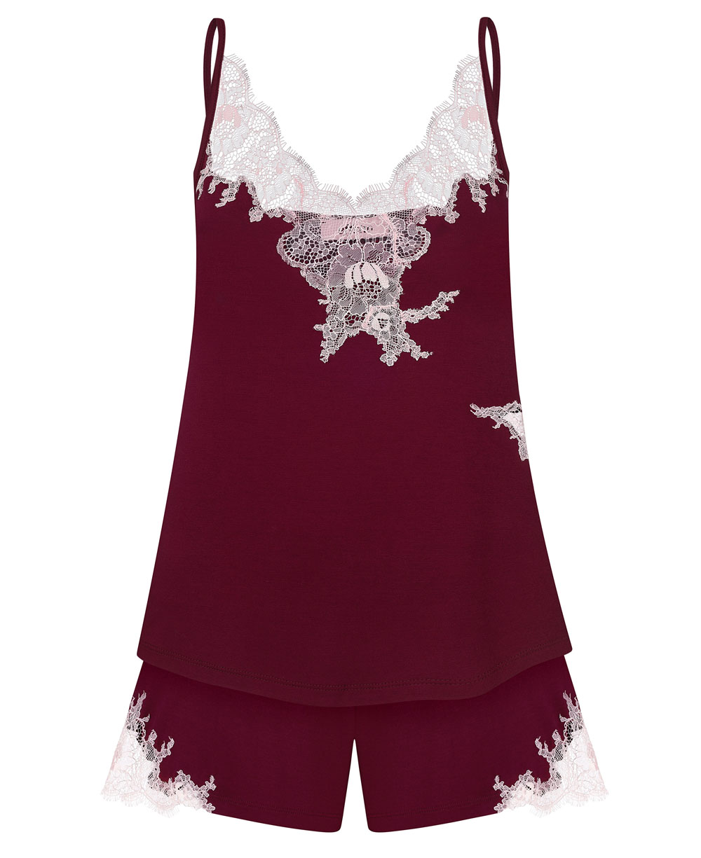 - Handmade мереживо: Квіткові мотиви на декольте та фігурне мереживо по боках шортів вирізані та пришиті вручну. Бордовий колір у поєднанні з ручною роботою виглядає особливо статусно.