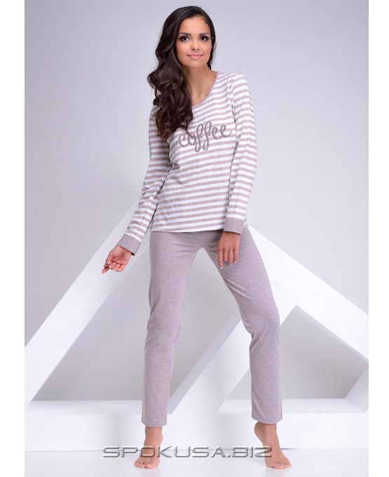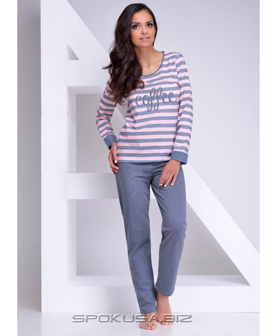 Жіноча піжама з високоякісної бавовни. Футболка з довгим рукавом в смужку, спереду має декоративний принт. Брюки довгі, гладкі і однотонні.