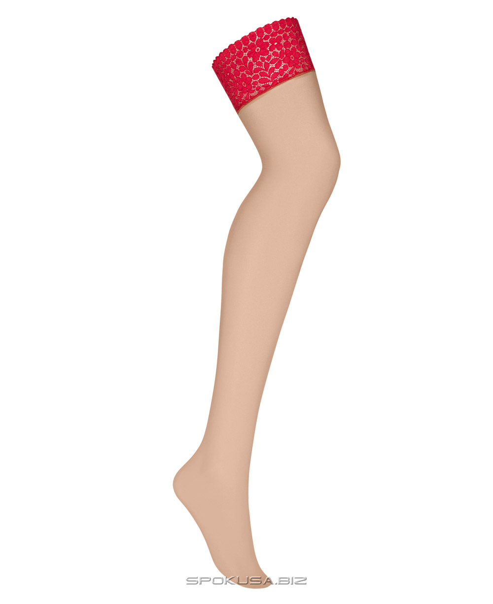 Красиві і тонкі панчохи бежевого кольору. Зроблені з напівпрозорого матеріалу з відмінною еластичністю. Панчохи зверху прикрашені вишуканим мереживом червоного кольору з квітковим малюнком, що спокусливо підкреслює стегна.