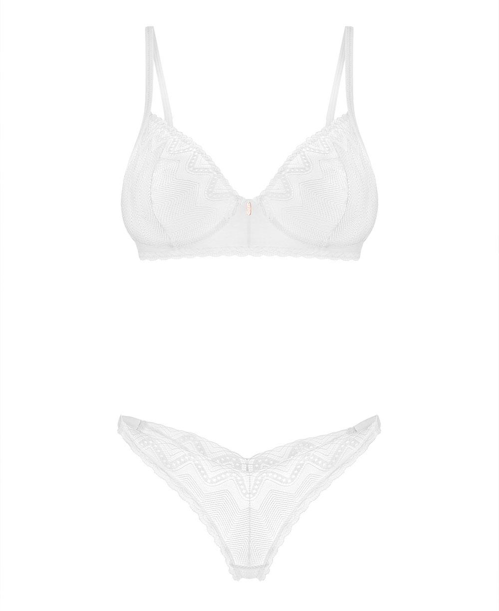 Чи може мінімалізм розпалити справжню пристрасть? Білосніжний комплект Alissium відповідає впевненим «так». Традиційний стиль білизни тут поєднується з інтригуючими геометричними мотивами, що пробуджують уяву. Бюстгальтер та стрінги майстерно підкреслюють ваші вигини, залишаючи незабутнє враження. Розкрийте свою чуттєвість та дозвольте фантазіям стати реальністю.