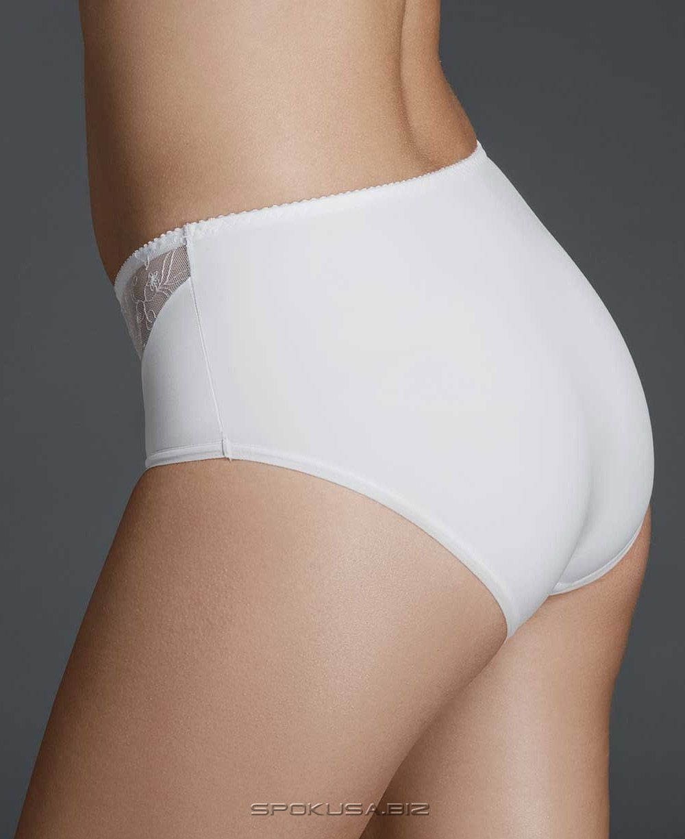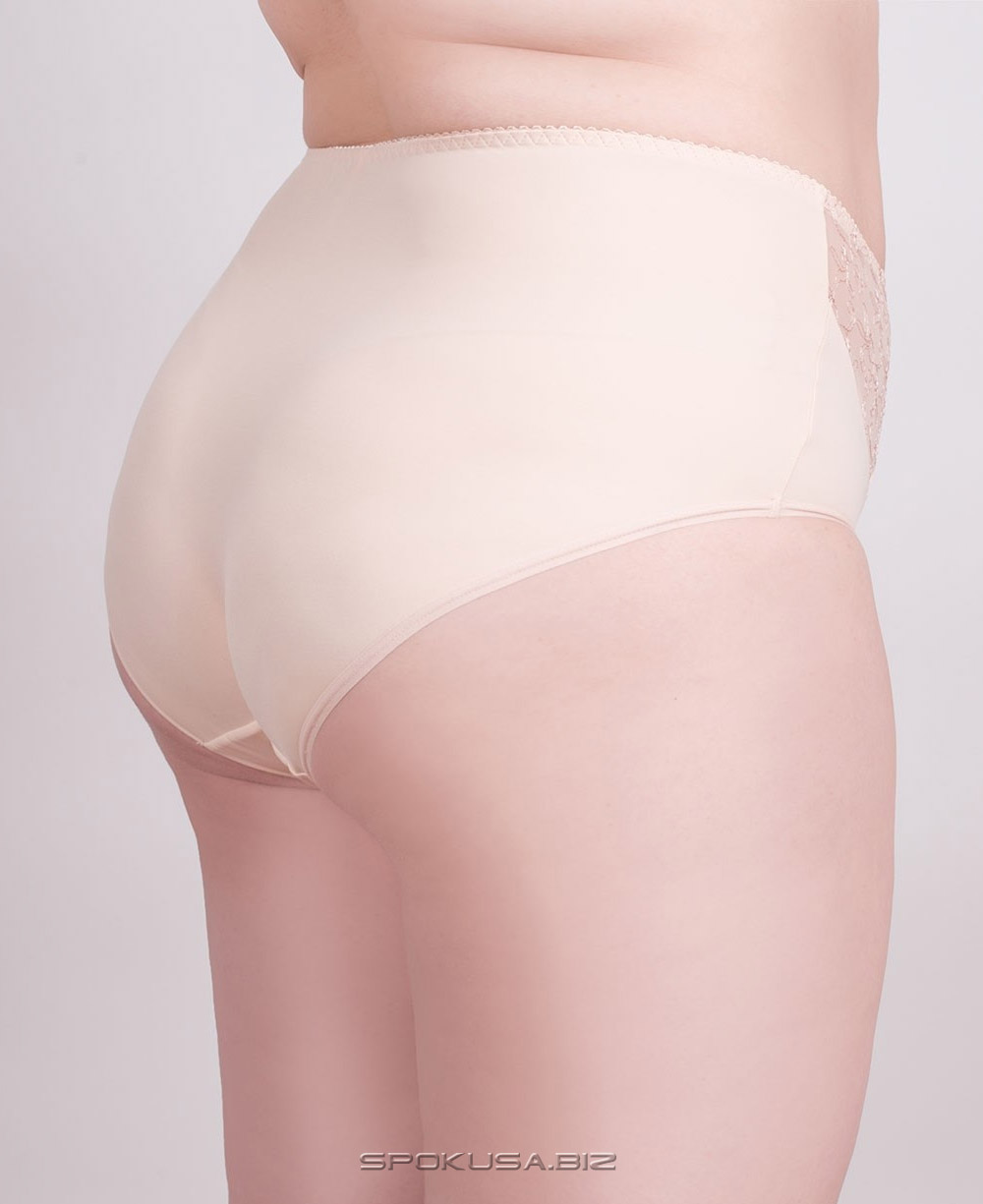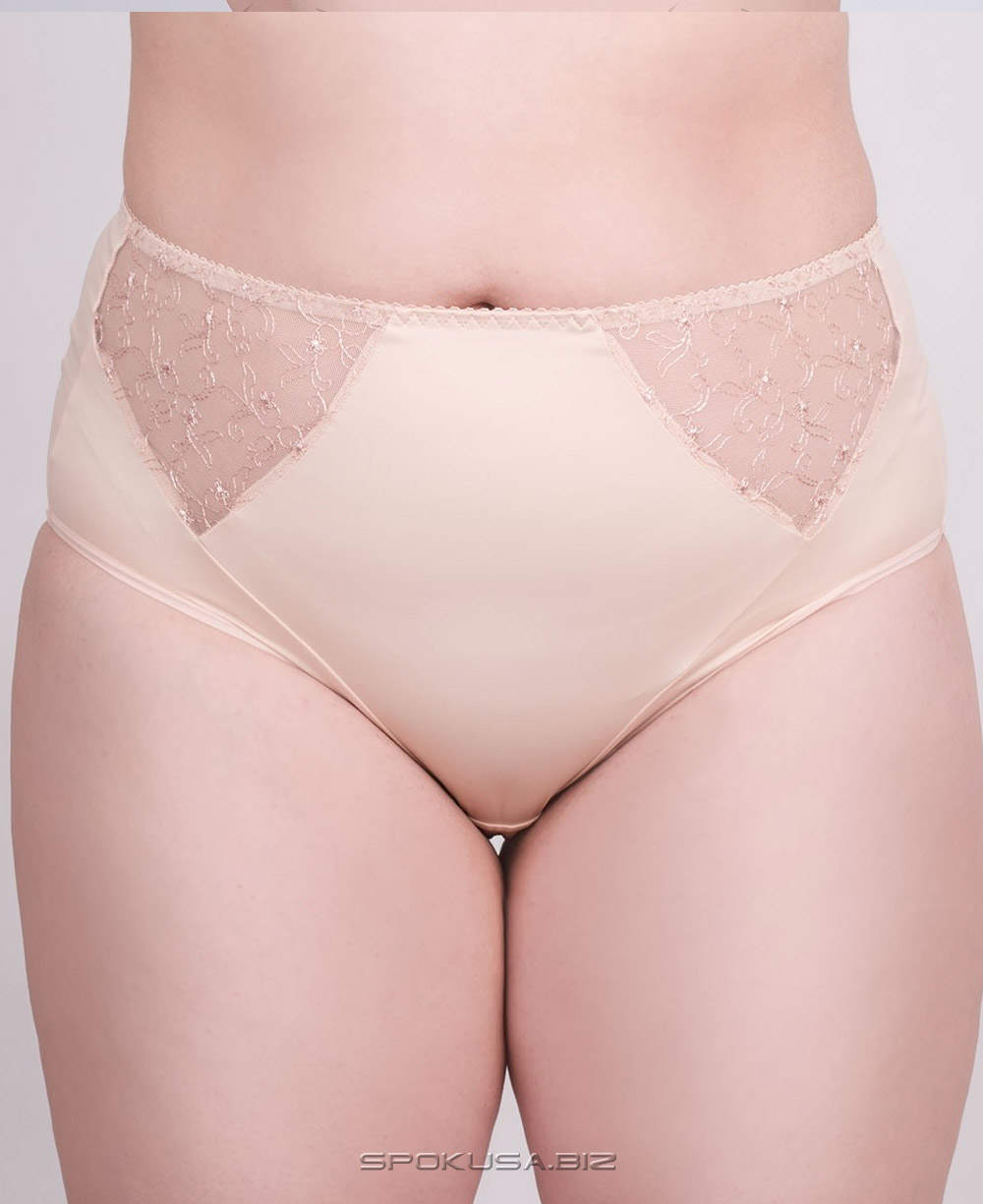 Жіночі трусики "сліп" зроблені з еластичного полотна та вишитого полотна. Модель з високою лінією талії для власниць пишних форм. Спереду трусики прикрашені мереживом з квітковим візерунком.