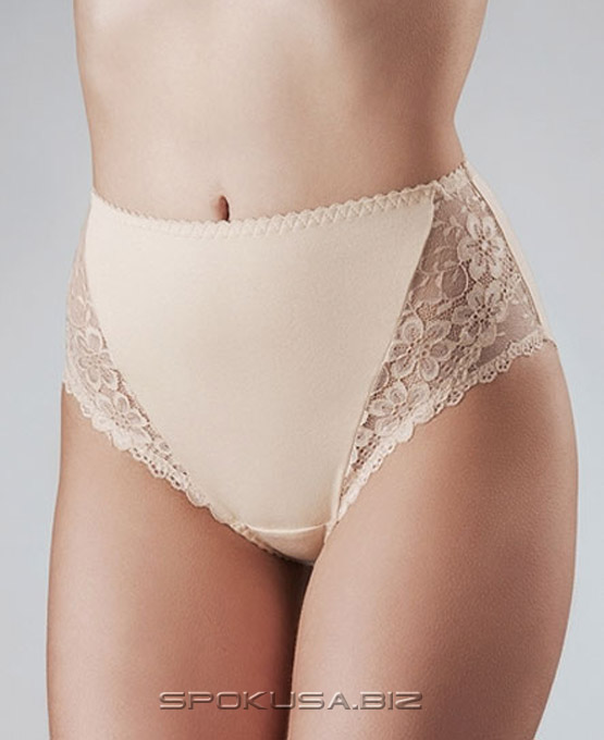 Труси з еластичного бавовняного полотна з високою лінією талії. Оздоблення - еластичне мереживо по бічних зрізах передньої деталі.