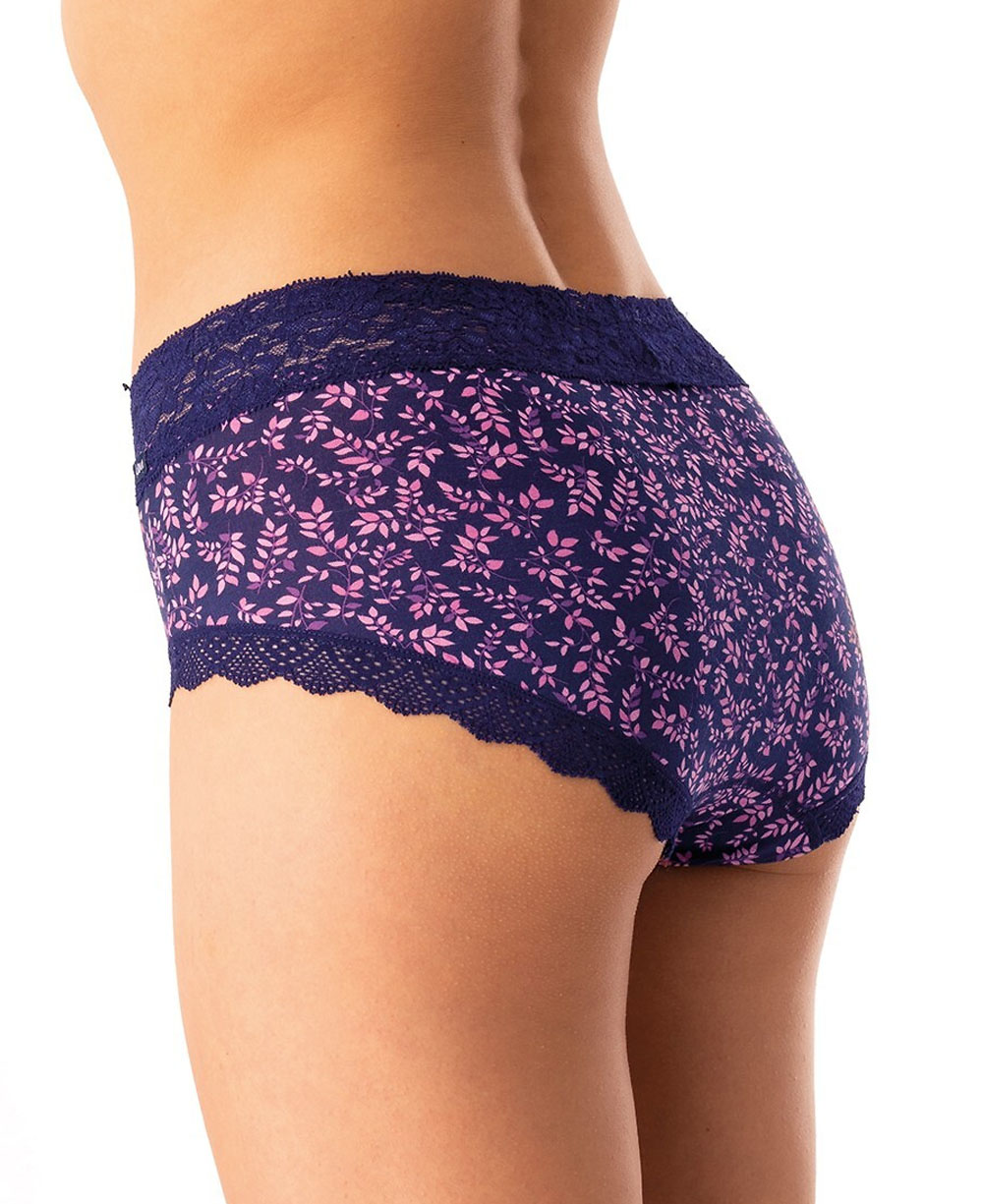 Модель прикрашена ніжним кольоровим принтом у вигляді листочків, що додає свіжості та жіночності. У поясі розташована широка еластична мереживна вставка, яка не лише фіксує трусики, але й створює витончений вигляд. Ширші бокові частини забезпечують зручну посадку, а повністю закритий зад оздоблено м’яким мереживом для елегантного завершення образу.