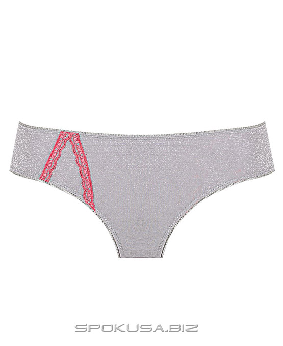 Трусики стрінги в модному кольоровому сполученні. Спереду трусики зроблені з блискучої тканини, оздоблені кораловим мереживом, ззаду зроблені з сіро-сріблястого мережива.