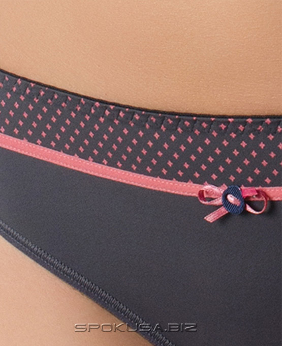 Трусики "сліпи" з еластичного трикотажного полотна. Середня лінія талії. Оздоблення - контрастна еластична тасьма і декоративна прикраса.